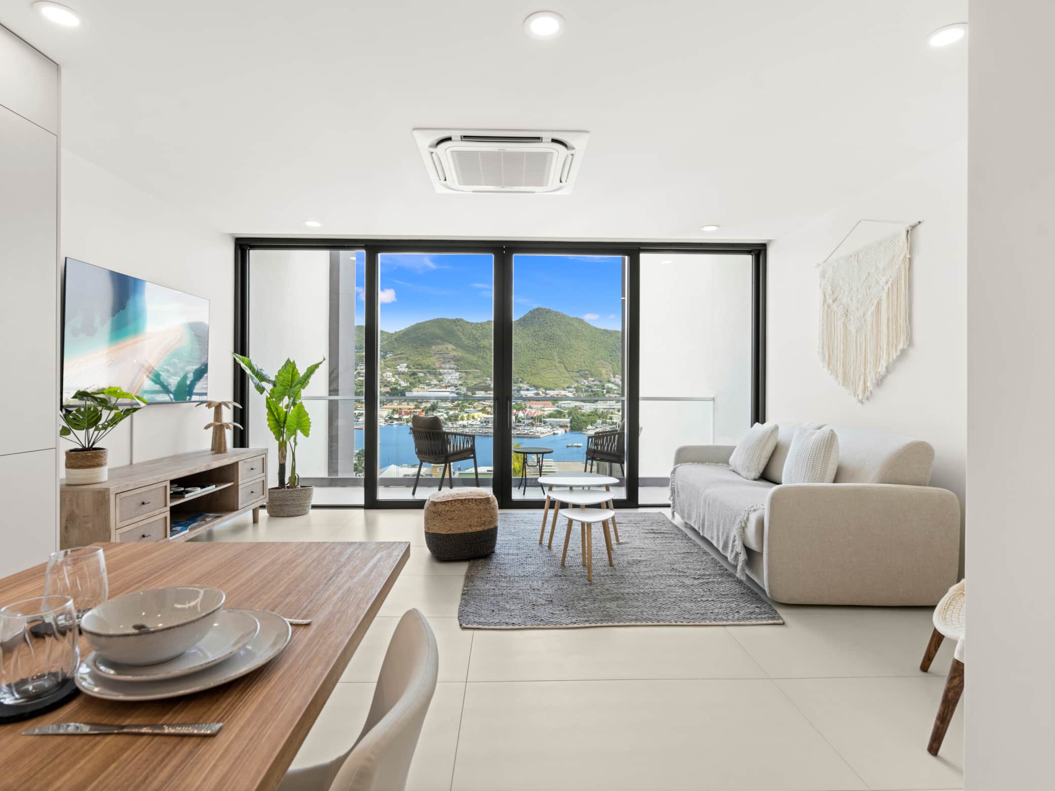 This modern apartment in Building 2 at The Hills Residence offers a private balcony with beautiful lagoon views, perfect to enjoy the Caribbean atmosphere. It features a comfortable bedroom, a contemporary bathroom, and a bright living room ideal for relaxation. The fully equipped kitchen includes a refrigerator, oven, microwave, stovetop, coffee machine, and all necessary cookware. Located in Simpson Bay, it is just steps from beaches, restaurants, shops, and vibrant nightlife.