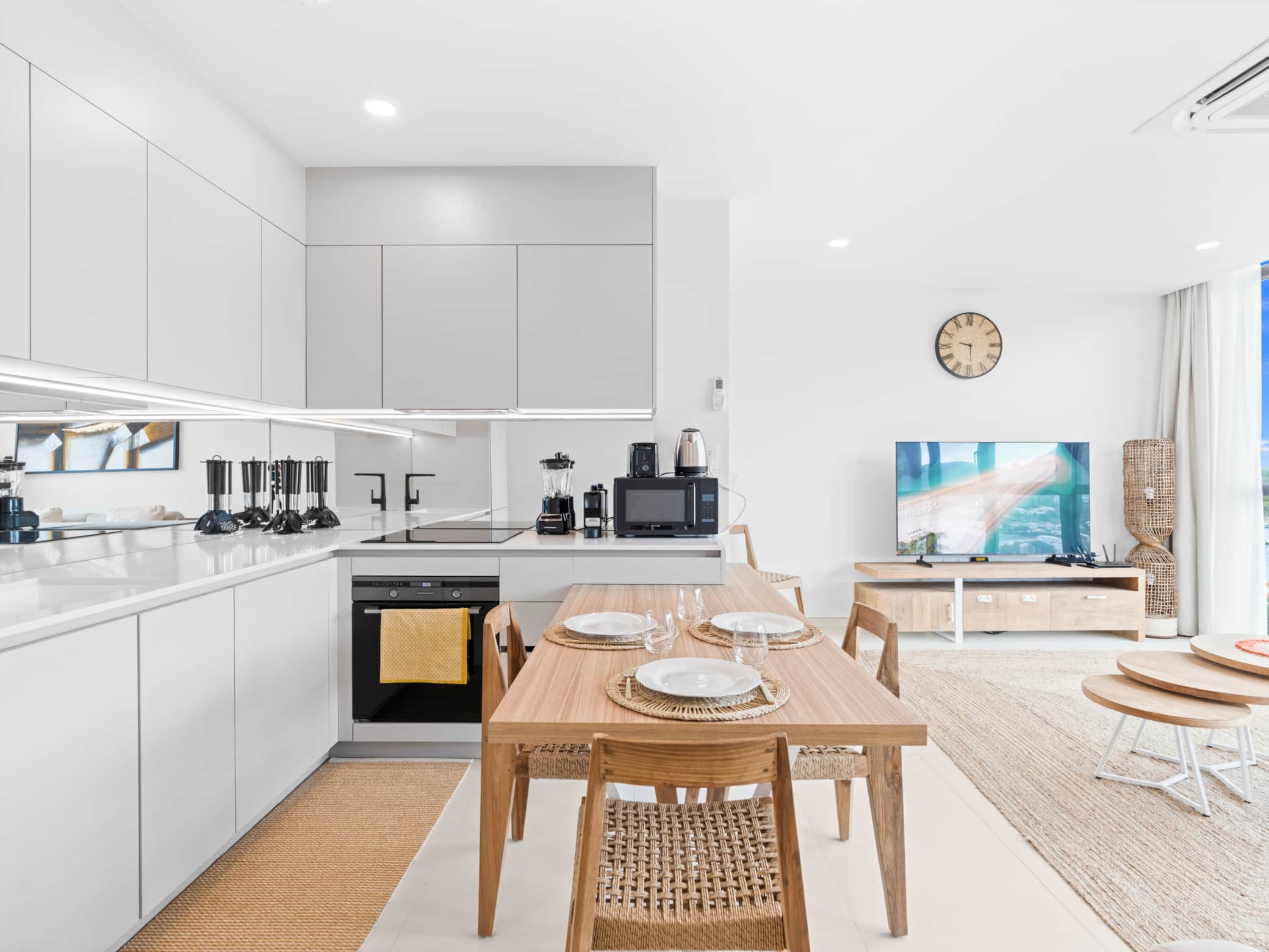 The open-plan, air-conditioned living space is perfect for relaxing after a day exploring the beaches or local attractions. The private balcony invites you to enjoy the tropical breeze while admiring the unique panorama of the lagoon, ideal for a morning coffee or an aperitif at sunset.